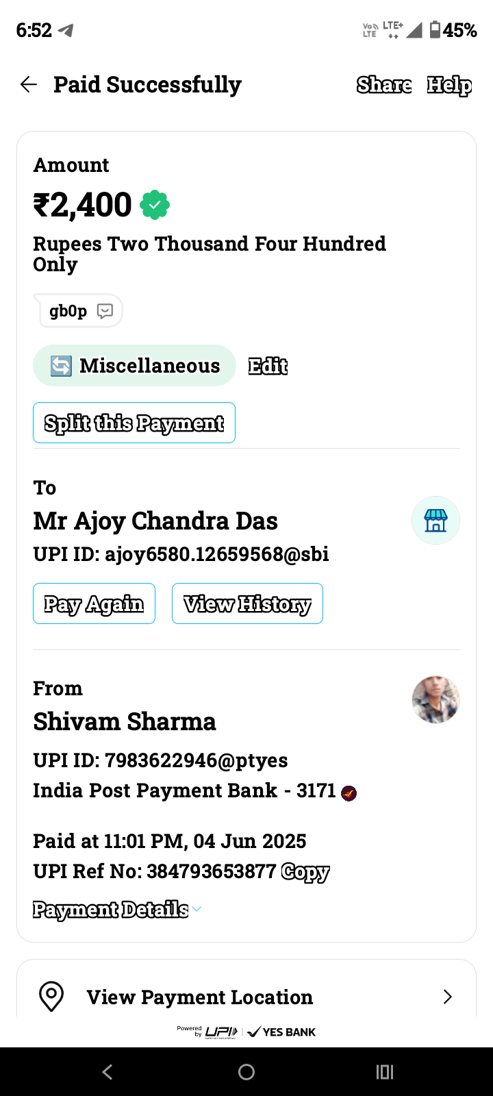 Hello my name is shivam sharma I was deposit in big daddy games but deposit not received my utr384793653877 and paid to upi id ajoy6580.12659568@sbi