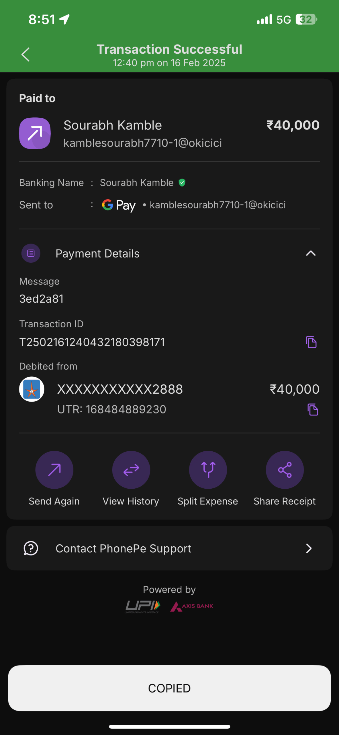 I deposited ₹40,000 to my 1xBet account on 16 February 2025 at 12:40 PM through PhonePe (GPay).
