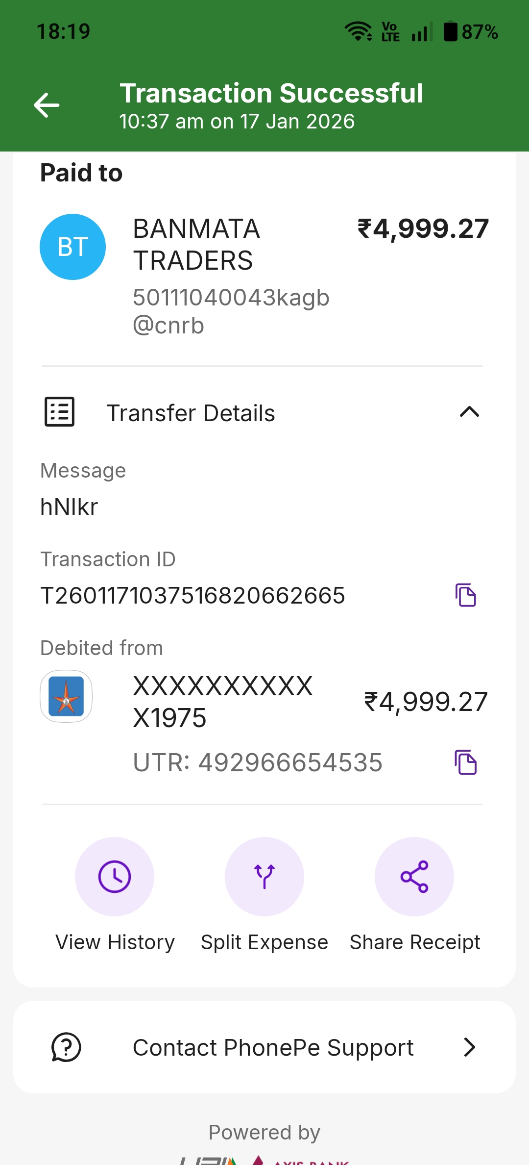 I have transfered through phonepay Rs.4999.27 to play casino vide order id 7238610116049254032 and utr no is 492966654535 but amount not credited to game wallet instead of several complaints.