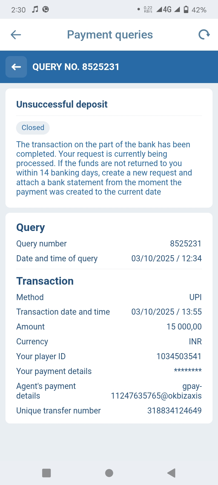 I have made deposit 15000 in 1xbet platform,my money has debited but not received in my gaming profile, And there executive Said it will be refunded within 14 Days . It’s not Possible for waiting 14 Days .It’s Simple Way to Fraud for customer.
