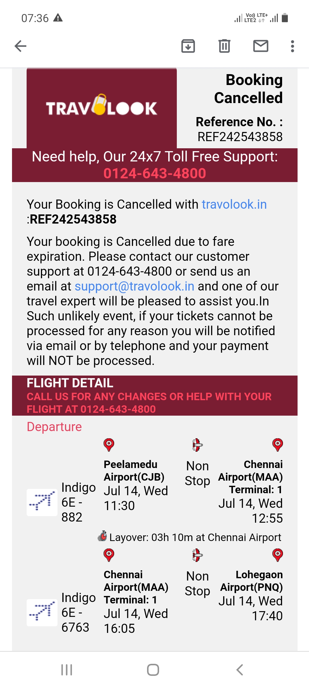 I have booked a flight ticket from coimbatore to pune for which I got reference REF242543858 and after sometime I got a mail that it got cancelled due to some operationalize issue and payment will be Refunded within 10 working days. Now its been 20 day I have been waiting for my payment. Last week I called up customer care of travalook they told me that your payment will be credited by Thursday 15th July but it is still not received. Even their call centre numbers are not getting picked up after my Last conversation