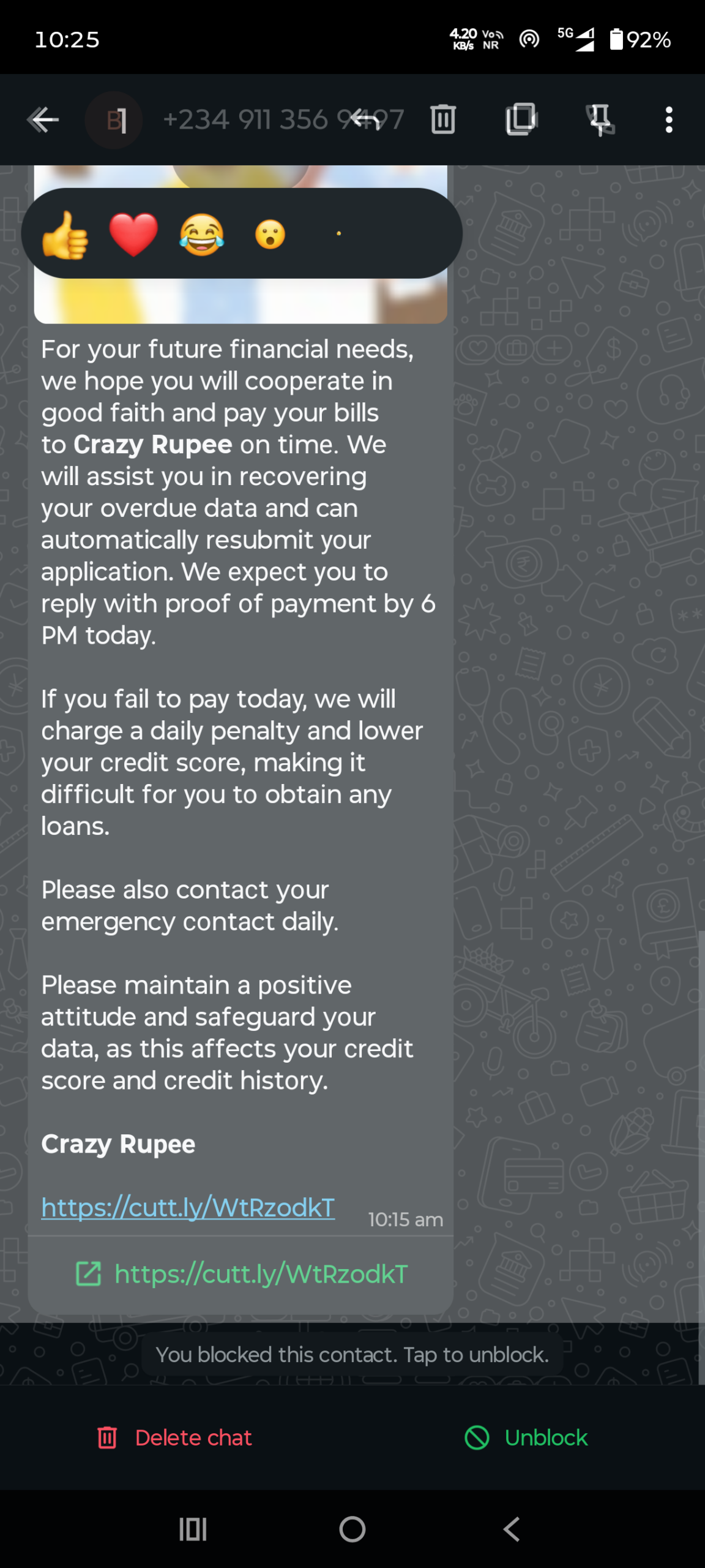 Did not take loan from Crazy Rupee but got whatsapp msg to repay and threatning to call my families.