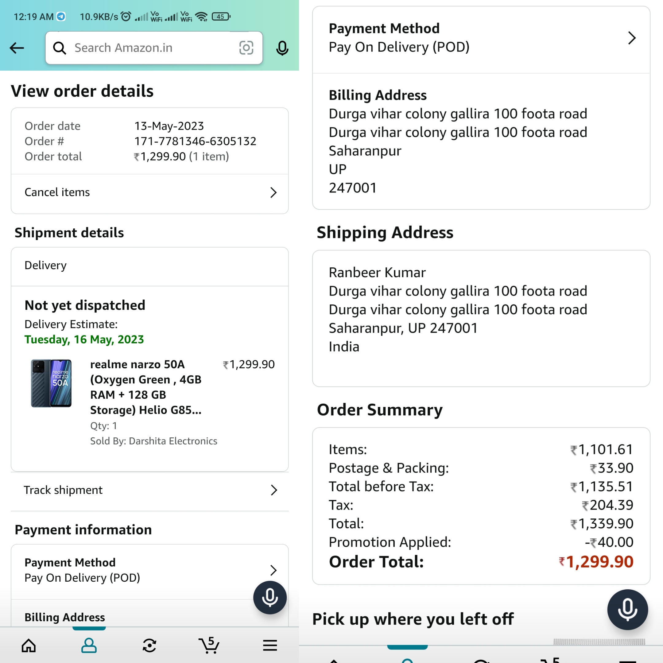 I have order an amazon product on 13th of May which was a smartphone REALME NARZO 50 A 4gb Ram and 128 gb storage the actual price of REALME NARZO was 12499 but due to discount or sale I am getting this phone at price of 1299 .