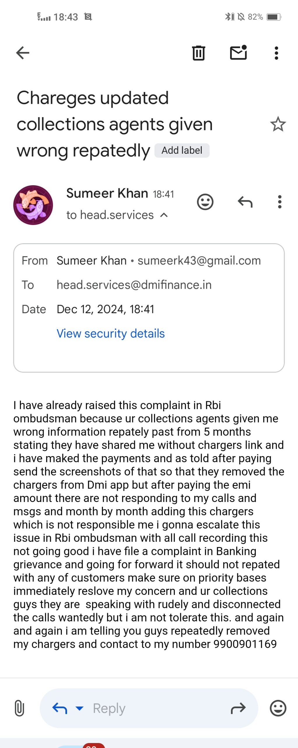 I have already raised this complaint in Rbi ombudsman because ur collections agents given me wrong information repately past from 5 months stating they have shared me without chargers link and i have maked the payments and as told after paying send the screenshots of that so that they removed the chargers from Dmi app but after paying the emi amount there are not responding to my calls and msgs and month by month adding this chargers which is not responsible me i gonna escalate this issue in Rbi ombudsman with all call recording this not going good i have file a complaint in Banking grievance and going for forward it should not repated with any of customers make sure on priority bases immediately reslove my concern and ur collections guys they are speaking with rudely and disconnected the calls wantedly but i am not tolerate this. and again and again i am telling you guys repeatedly removed my chargers and contact to my number 9900901169