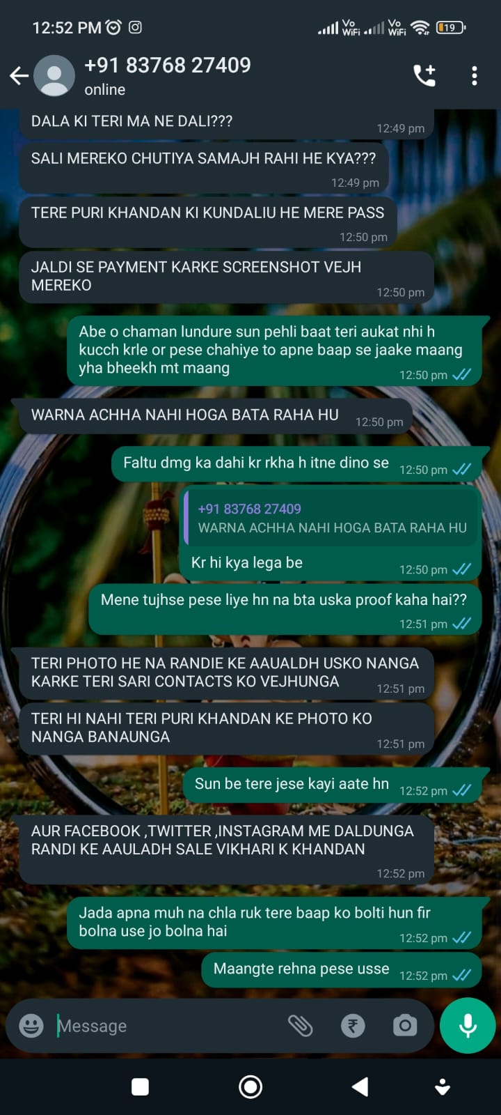 I called that number for the clarification, a lady picked up the call and informed that they don’t have any WhatsApp account from this number, so I just blocked the number I again got the same message from different number which was having the same case, so I blocked that too, from the third number I again got the same message and this time they are blackmailing me by saying that we are having your contact list and we will harass them to pressurise me for the repayment, I just blocked that number too.