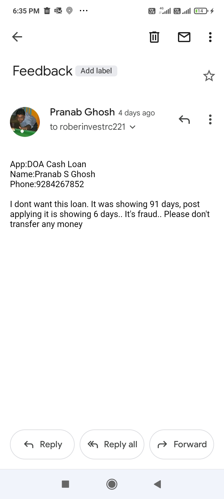 I completed all the formalities. And they cannot show how much loan they will be disbursing. It showed 16 k approved for 91 days and when I pressed ok. It gave 4400 and that to for 6 days. Before disbursement I saw the days for repayment and i wrote mail to them that i dont need money.. Still they disbursed and today 5th day they started torchuring. Sending bad messages with my photo to all my contacts.. Please help.. I am ready to paybthe amount I recd from them.. Pls help