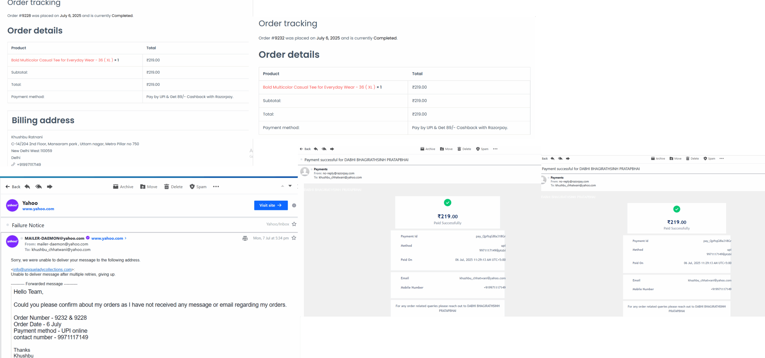 I have placed 2 orders on 6th July 2025. Order number 9228 and 9232. I have not received any order confirmation email. The amount got deducted Rs. 219 and Rs. 219 from my account. I have received the payment confirmation email. However, I am not able to contact them. I tried customer care number it says “temporary out of service” Also, the email id is not valid. I got the delivery failure email. Could you please assist me to get the money refund if this is the fraud website. I saw two similar websites selling the same product also the website is almost same with different names.
