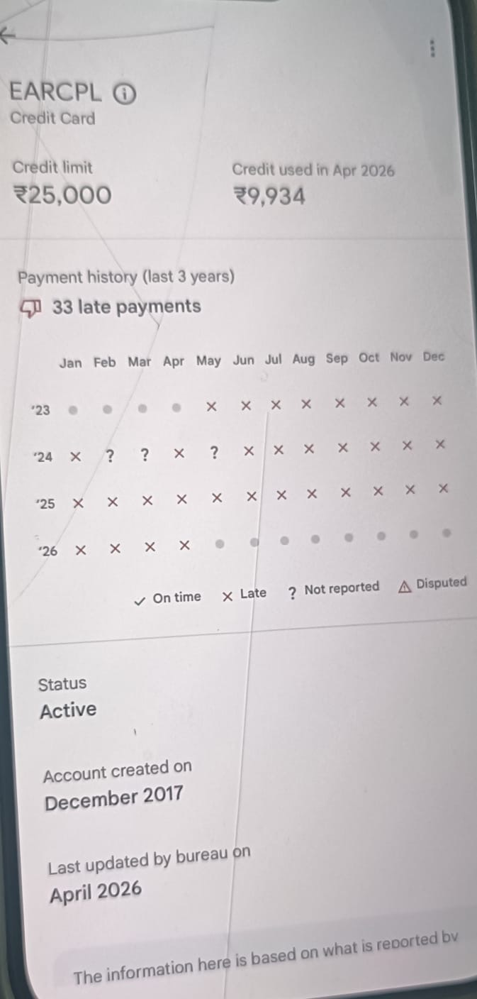 The credit card by EARCPL has been issued under my name sometime in , December 2017with a last update by bureau date as December 2017 . This card has been regularly updating delayed payments under my name for a nominal amount which has severely impacted my credit scores. I do not know whom and where to make the payment, or to close this account which I have NOT requested.
