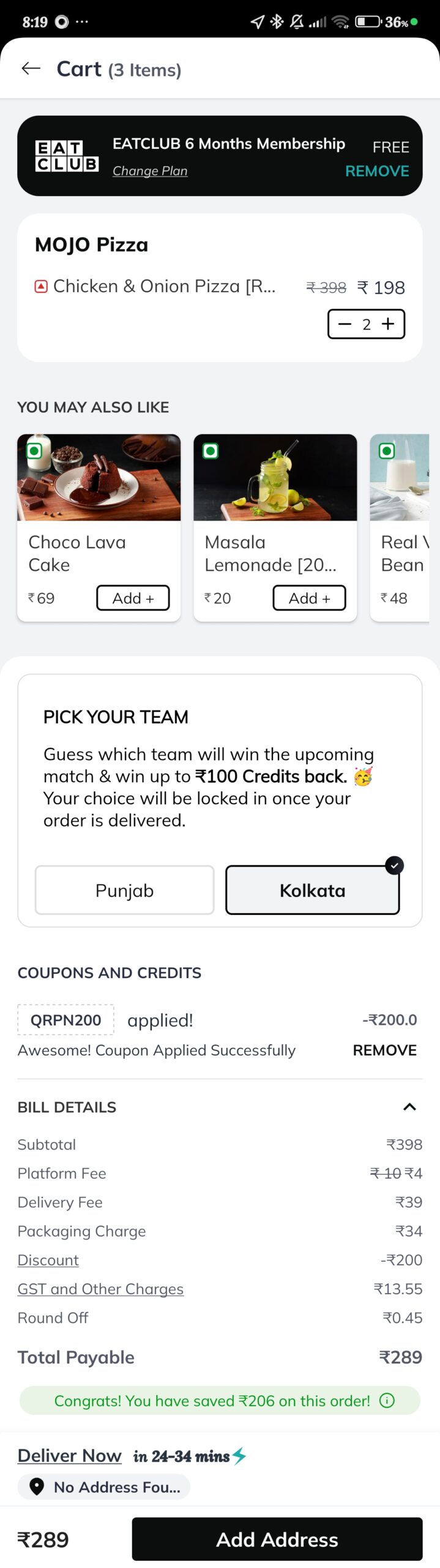 Eatclub gives Rs. 200 flat discount on first order. However they just add this 200 in the subtotal value. My order value was Rs. 198 but in bill details it shows that the total value is Rs. 398 so they don’t give us any discount and this is fraud marketing. Also it claims that users having membership will get zero packaging charge and zero delivery fee but you can see it clearly that they are charging for it.