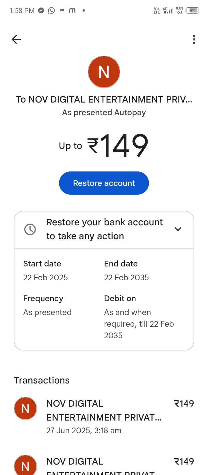 मेरे गूगल अकाउंट से अपने आप ऑटो प्ले के माध्यम से 149 रुपए नोवा डिजिटल एंटरटेनमेंट कंपनी द्वारा फर्जी वाला तरीके से काट लिया गया है या यू कहे कि अकाउंट से चोरी की जा रही है कृपया इसे संज्ञान पर लेकर इसकी कार्रवाई करें