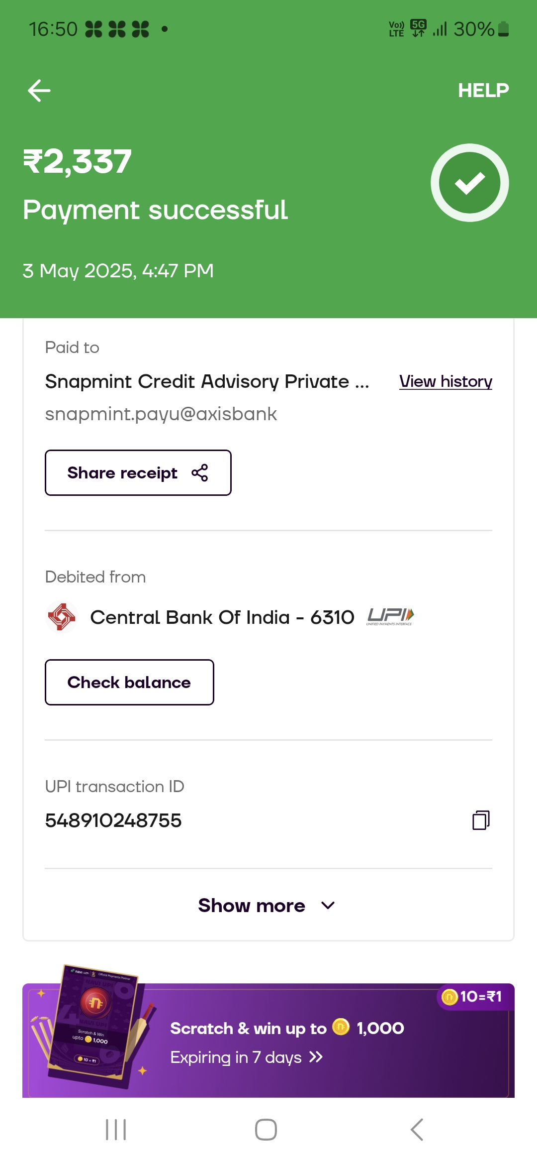 I paid all EMI of may month but not show in snapmint app..and they also cut my bank account. Than what I do now ..they have no reply and back answer