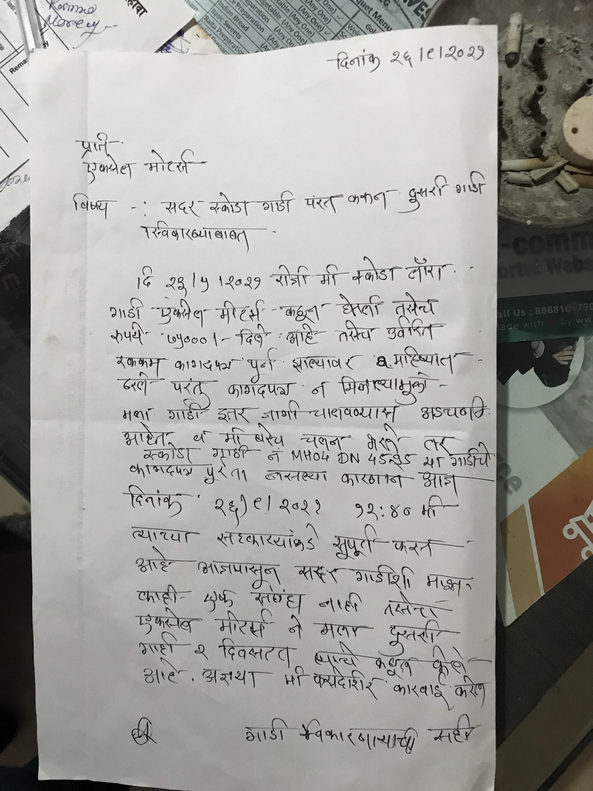 On 25 may 2021 I purchased a motor vehicle from Excel Motors Nashik Mumbai Naka Chand Bhai. Skoda Luara MH04DN4596 Unfortunately, the vehicle has not been satisfactory because the vehicle paper is not clear and when i ask for the vehicle paper Mr Chand bhai owner of excel motors ignore my calls and not provide any response and the car has leaking oil from the engine and other electrical issues when i am call mr chand bhai he collect vehicle from my house dated 26 sept 2021 and promise me to refund money either Provide another clear paper vehicle because of non paper i am not able to use this vehicle and till date Mr chand bhai not provide me refund either another car as his 2 days promise .