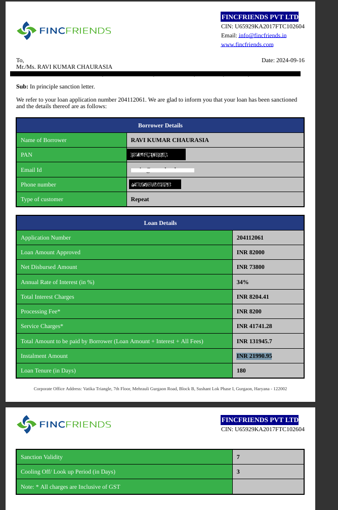 I am writing to file a formal complaint against RupeeRedee (Moneymitra IT Solutions Private Limited) regarding a loan I obtained on September 16, 2024. The loan was for ₹82, 000, but I only received a disbursement of ₹73, 800. The loan agreement stipulates a processing fee of ₹8, 200 and service charges of ₹41, 741.28. The total repayment amount, including all fees and interest, is ₹131, 945.7.