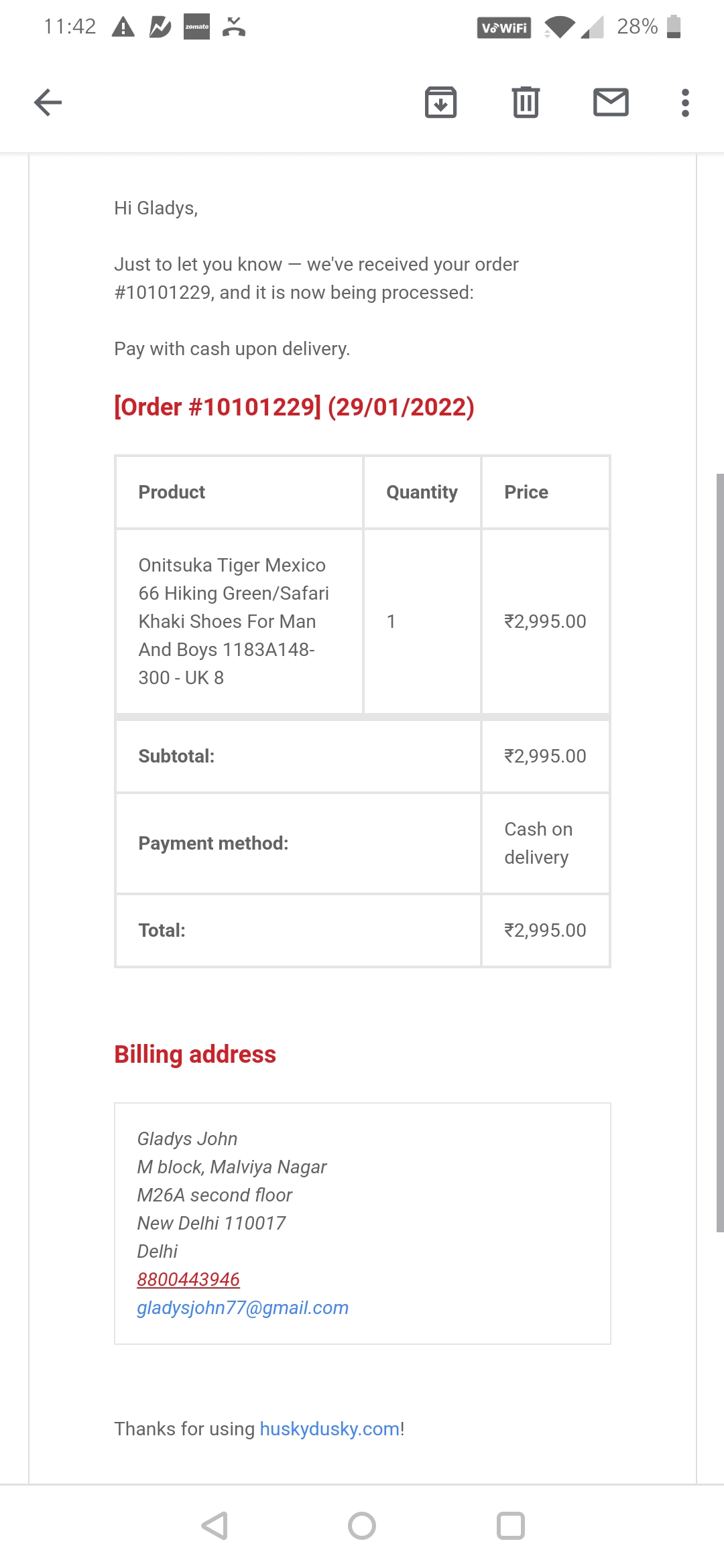 I had ordered an Onitsuka shoes [Order #10101229] on 29/01/2022.