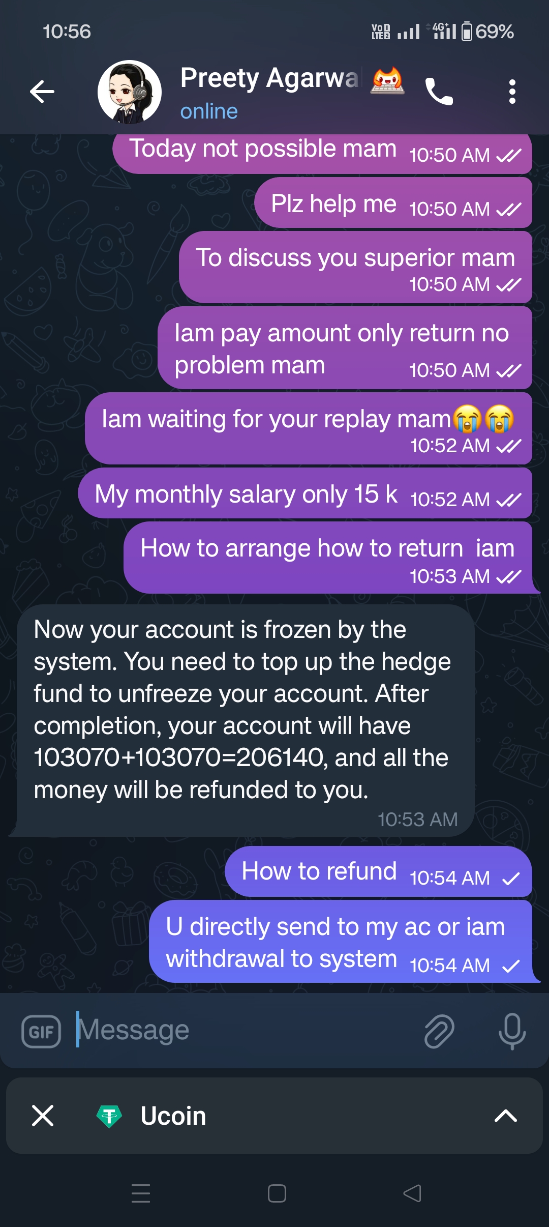 lam lass 73k this scam first time pay 1000 return 1410 Second time 7k pay told 10330 return told but Task complete ofter told again one task completed ofter refund code send it but again deposit amount is 25 k 3 rd task pay tha amount 25 k but not returned amount again told this is final task this task completed ofter refund code send it you cash refunded told last task amount 37800 iam pay tha amount completed the task ofter refund code send it but withdrawal process person told this is large amount so u fill tha account details ond you withdrawal process iam try to withdraw first 1500 ofter 1500 told but iam try first 1500 20 minutes affter iam recovering 1500 ofter iam try to 30000 rs but transfer not completed this system ac freezing lam asking how to refund my amount our told you pay same amount in your ac pay ofter unfreeze tha account my ac balance is 103370 Same amount deposit ofter unfreeze tha account told