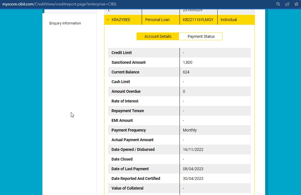 When I checked my cibil report i found a Fake loan account for the amount 1800 in the name of KRAZYBEE which I hadn’t inquired or received money. Please take necessary action to remove fake loan account from my CIBIL report.