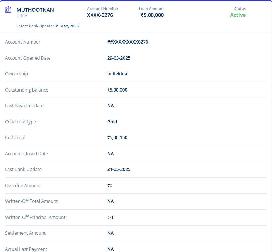 I will be checking my cibil report on monthly basis. When I was checking, I got to know that there is one fake loan showing in my cibil report of 5 lakh which I have not taken. Loan Belong to “MUTHOOTNAN” and Loan Account Number is XXXXXXXXXXX0276. Which is Not Belong to Me and I am Not Guarantor