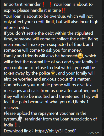I am getting random whatsapps messages.They are threatening and harassing me to pay the amount .which I haven’t received any money as such. Please help me out from this disturbance and I’m getting messages that they will call up my contacts and family members. But i have not received any money from them