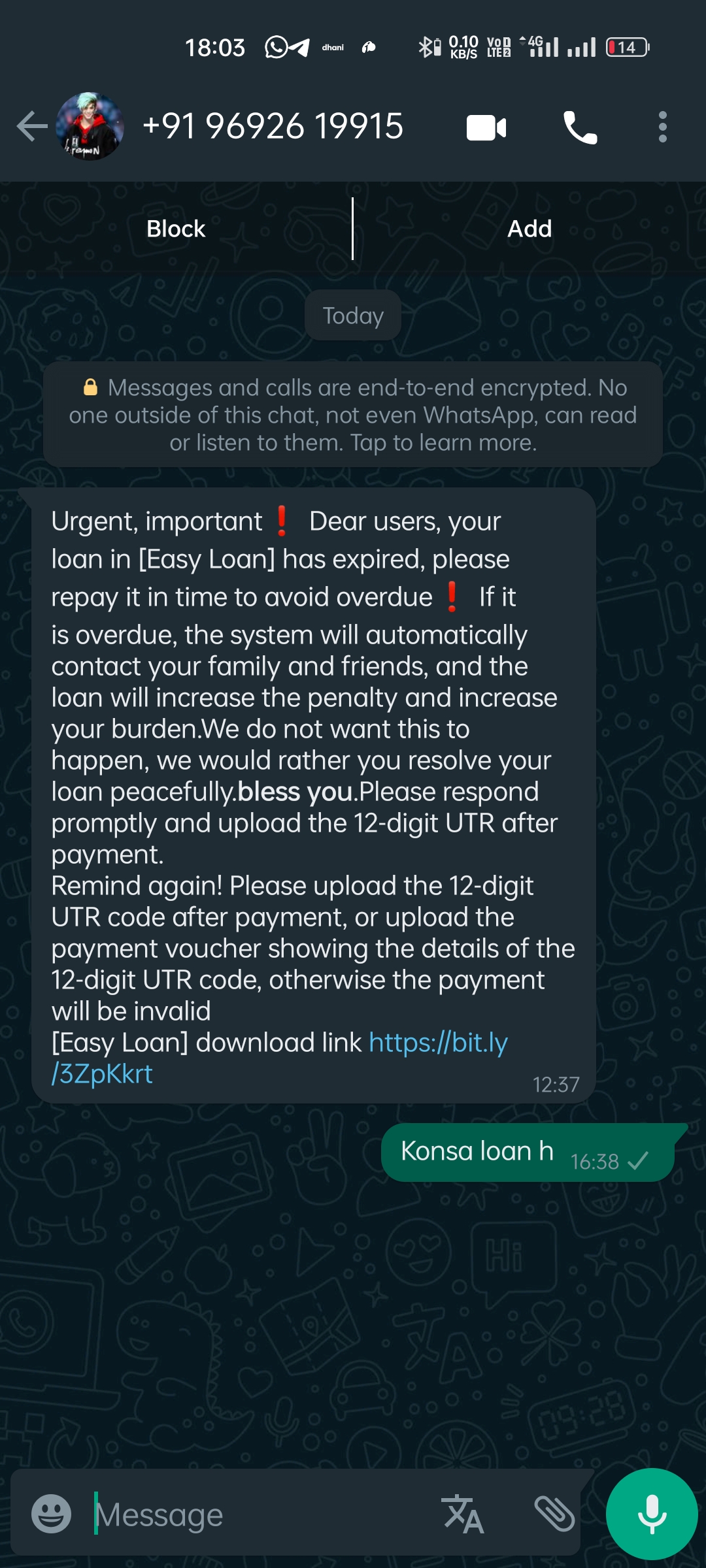 We do not want this to happen, we would rather you resolve your loan peacefully.*bless you*.Please respond promptly and upload the 12-digit UTR after payment.