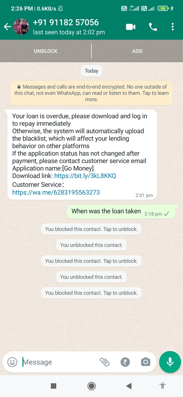 Today, I got a message again regarding fraudulent loan recovery from one of the loan app “GoMoney”. I haven’t take any loan. These guys are making fake loan profile and sharing you a message and the link of the app where you do login and get the fake detail, it will show you only the amount. the loan taken date will be of one week before and due date will of current date.