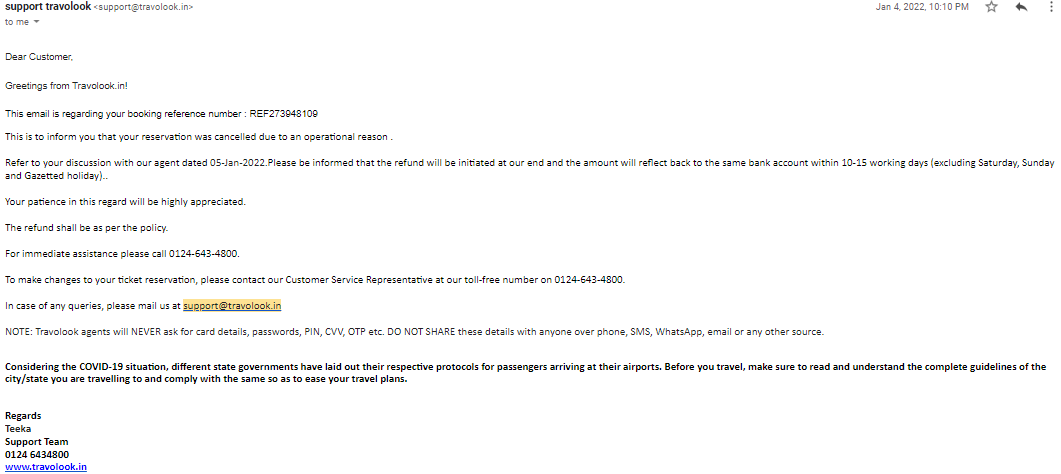 I booked one flight tickets (From kochi to Hyd) from the website https://travolook.in. The ticket was for travel on 04.01.2021 with reference no. REF[REF273948109]. The total amount deducted from my account was Rs. 4932. Just after the booking I received a call from the company which said that due to sudden increase in fares by airline, the PNR numbers could not get generated and so they have to cancelled my booking. The support executive also added that the process of auto refund will take a maximum of 10-15 working days and I can retry booking ticket after 3-4 hours. Surprisingly after 3 hours, I booked the same ticket at the same price. During past one and a half month period, Employs Id’s 149 pooja and 255 Naman, I called them three times to know the status and every time the assigned support executive said the same thing, “due to some technical issues the auto refund got cancelled. The case is escalated and they have initiated the refund again, manually, and it will take another five working days for money to be refunded in my account.” Now I feel trapped as when I ask for any complaint number or want to talk to their seniors they disconnect the phone. It always take 15-30 minutes before any executive will assist the call. I am very worried as they seem to never going to give me the money back. Please assist me how the matter can be taken up with correct authority. I will be very grateful. Thank you.