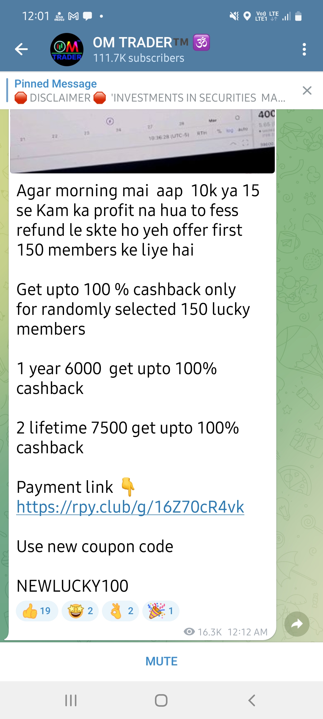 On promise of 100% cashback and classes for trading in share market, I transferred 7500/- on 17-Feb-2023 to Om Traders, via its payment link which was redirected to Rigi Club. Then after neither Rigi Club on whatsapp not OM traders responding. Please ban this type of fraud, currently they still forging people with same scheme. Please help me to refund my hard earned money.
