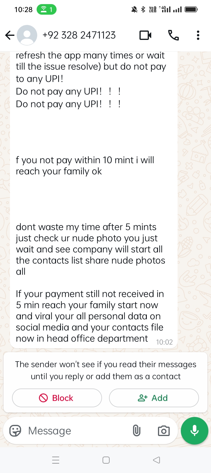 Dear Sir Finance. Credit Version is a loan app. A few days ago I took a loan from them. Its loan provider was Sari Cash. Their agent threatened me to repay the loan by sending me nude photos on WhatsApp before the due date. I immediately repaid the loan. Now they are asking for Rs. 3000 by keeping my Aadhaar card, PAN card, bank details, phone contact details and threatening to blackmail me. What should I do Sir? I had not taken a loan of Rs. 3000. Please help me Sir.
