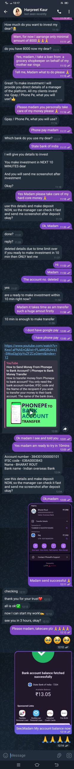 Today Dated- 28/08/2024, I have been told to invest the amount of 7990/- so that i can get huge amount in return in 3-4 hrs, later this Harpreet kaur send the bank Account No.384301000000101 of Bharat Rout in Indian Overseas Bank as her Manager and i have invested 7990/- and after 3 hrs she told me that I won a huge amount and to withdraw that i will have to pay commission of Rs 23902.20/- and is 100% refundable, When i told her i cant pay that amount , she say no to me , Please help me get my money back.