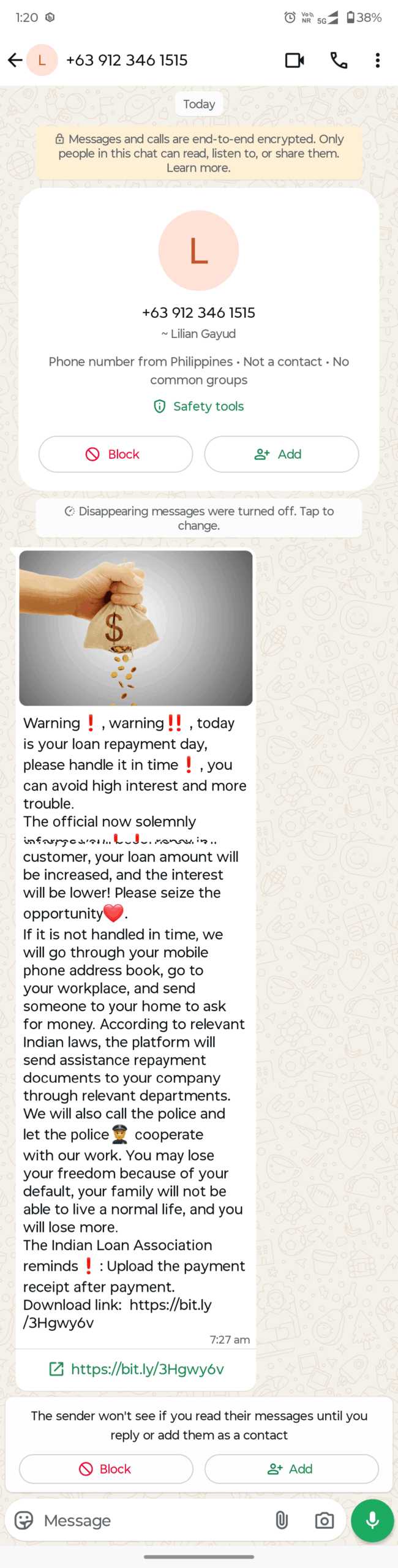 So I’ve been receiving these messages from morning saying that I have a loan overdue from an unknown app and is asking me to download the app through an illegal link , I haven’t even seen that app before so how I’m even able to take loan from them when I try to download the app it asks me to login with my mobile number and is asking for permissions this is where I know that this is a scam happening towards me , please help me with this issue