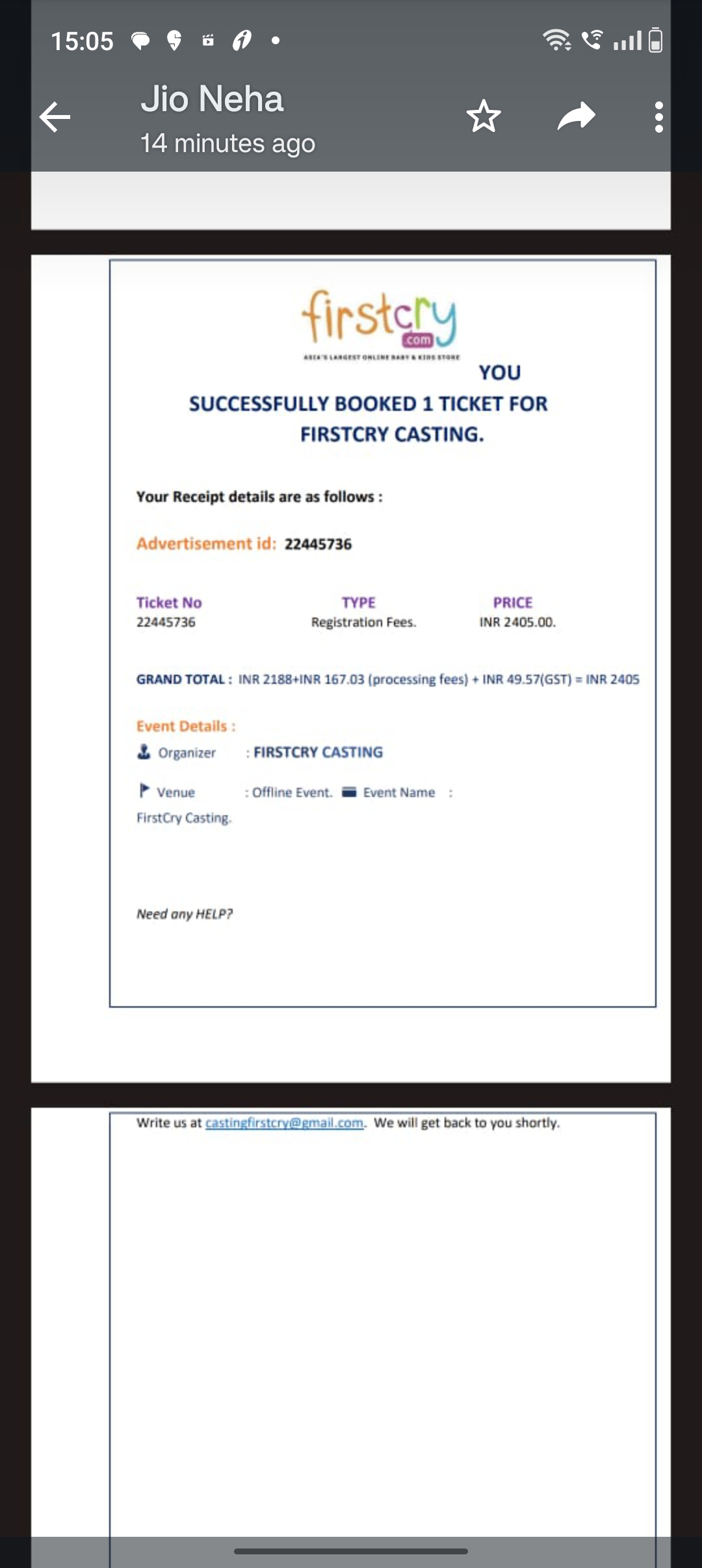 I received a call from first Cry for casting of kids on 16th April 2023. They told me to deposit the amount of 2405 and they give me receipt of the same. But now they are not receiving any calls.