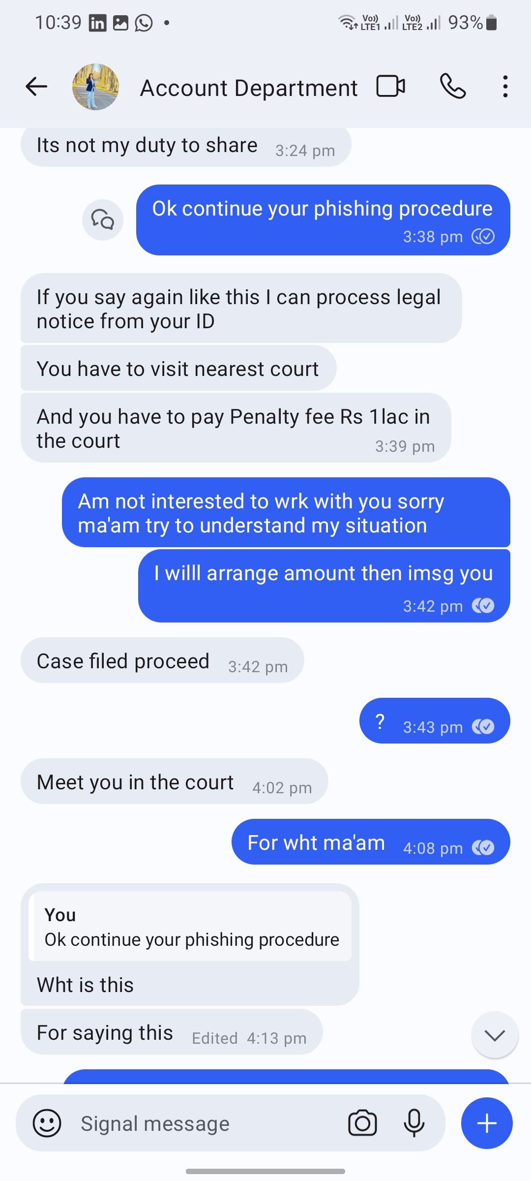 Then she said legaly moving towrdss me case filed proceed and so on first i afraid it but the way of talking will some thing fooliness.