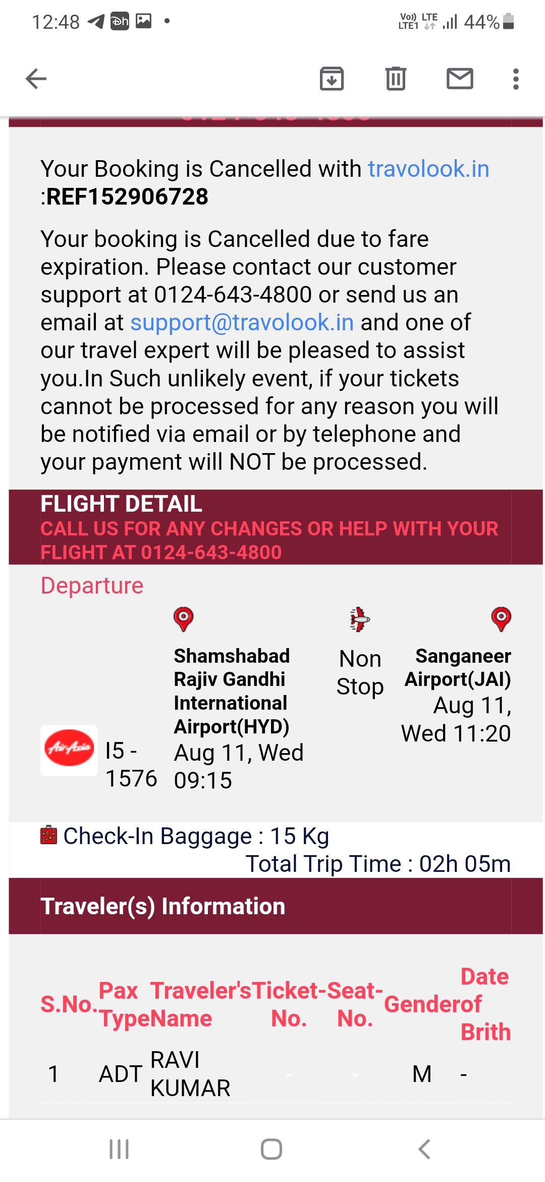 I have booked a flight ticket from hyderabad to jaipur on 10 August 2021 my ticket was of date 11 Aug 2021 .but on 10 of August i have got a call from travolook that your ticket have been cancelled due to pnr no not generated and you will receive the payment in 7 to 10 days but after 35 days I have not received my payment and they are not giving any satisfied answer after calling so many times.