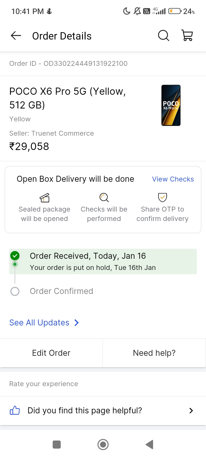 I have Ordered A Smartphone On Flipkart Named Poco X6 Pro on 16/01/2024. But My Order is still Put On Hold. Can I Know Why Is it Happening ?