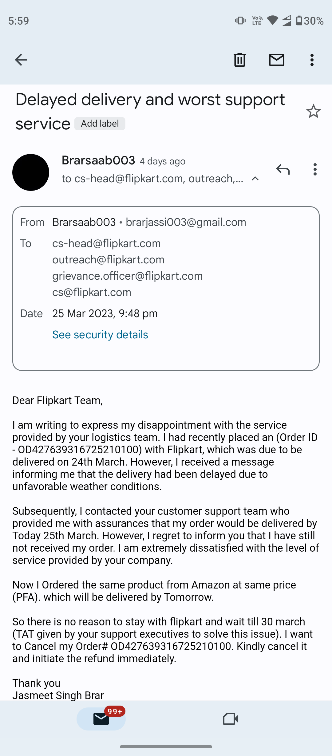 I order a earphone via Flipkart and they assure me it will be delivered by 24th march. But not delivered then i contact flipkart they assure me to deliver it next day 25th march. same thing happenednot received my order. Then i order same product from another company and received next day. I request flipkart to cancel my order but they told me to wait 24hrs from 26th march. 72hrs passed but still issue not resolved i have already email them and request on twitter also but nothing works.