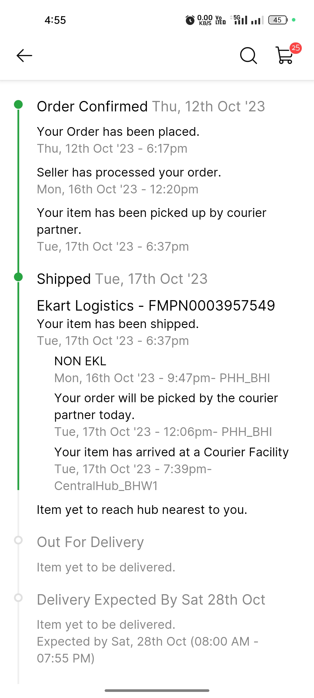 I have ordered blue star air conditioner on hdfc emi on 12 October 2023 and my first installment debited on 20 of October 2023 still i didn’t get my order.flipkart order delivery date was 28 October 2023 but they failed to deliver my order and also not tracking my order on ekart logistics it shows tracking error.