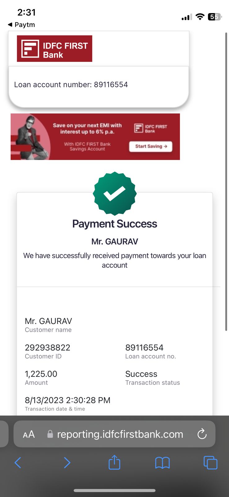 On August 13, 2023, I paid my dues to IDFC Bank, Flipkart’s partner bank, in the amount of INR 1225. This payment included INR 225 as late payment charges. Prior to making this payment, I was explicitly assured by Flipkart’s customer service representatives that the INR 225 in late payment charges would be promptly refunded to me.