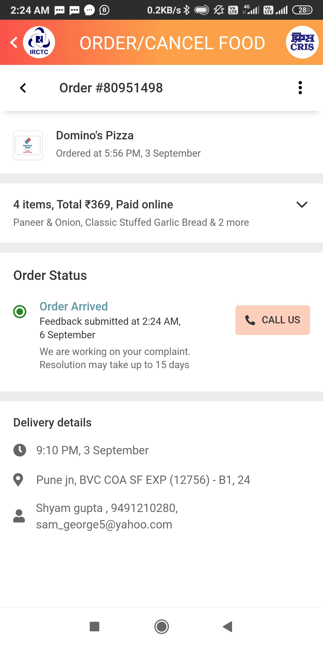 Ordered food from Domino’s through Domino’s Pizza with not delivered after getting the confirmation of order placed