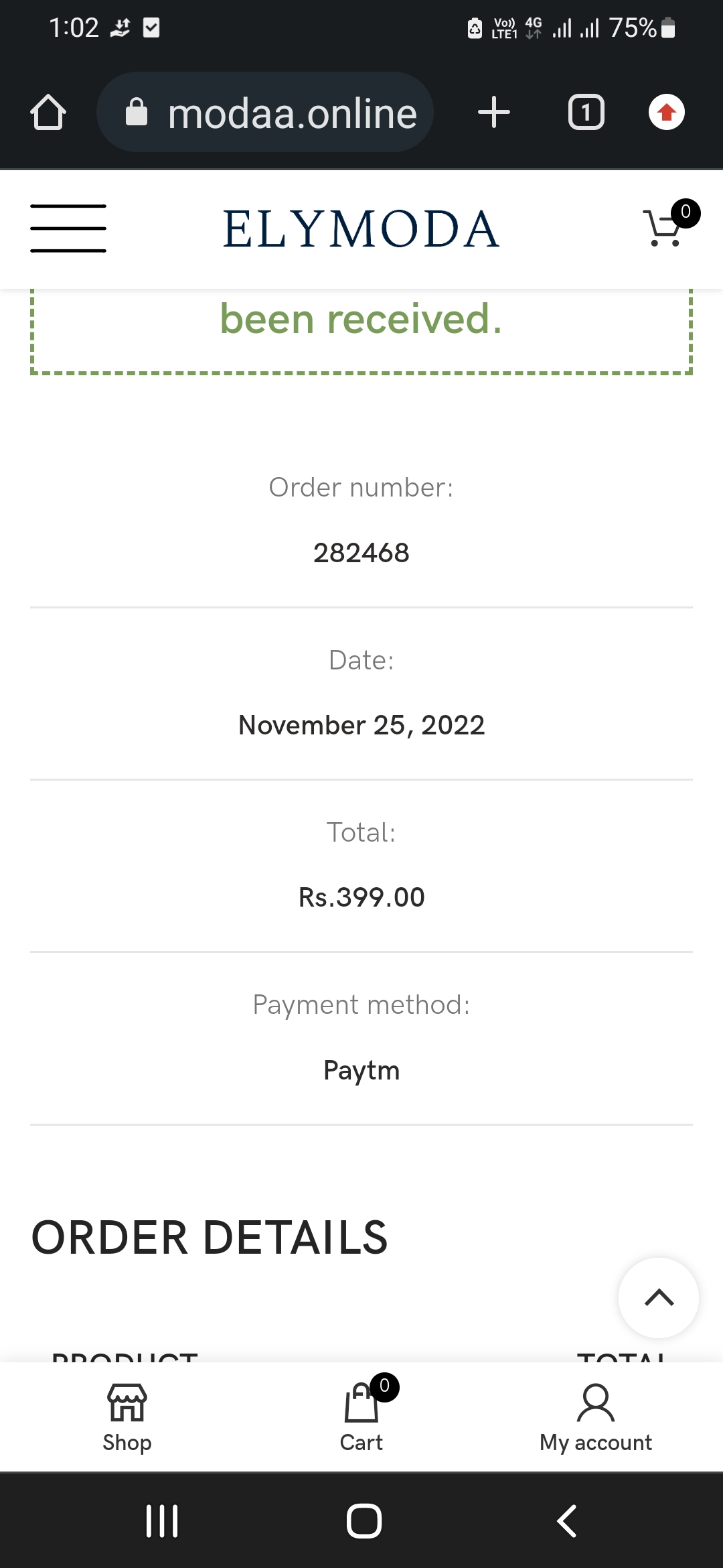 My order number is 282468, after booking and paid booked purchase amount Rs. 399, I was not received any message or Mails for my Booking confirmation till next day, then I was call website Contact Number 958258658 but number continues going to switch-off, then I send a mail on as per Website provide email ID elymoda@gmail.com
