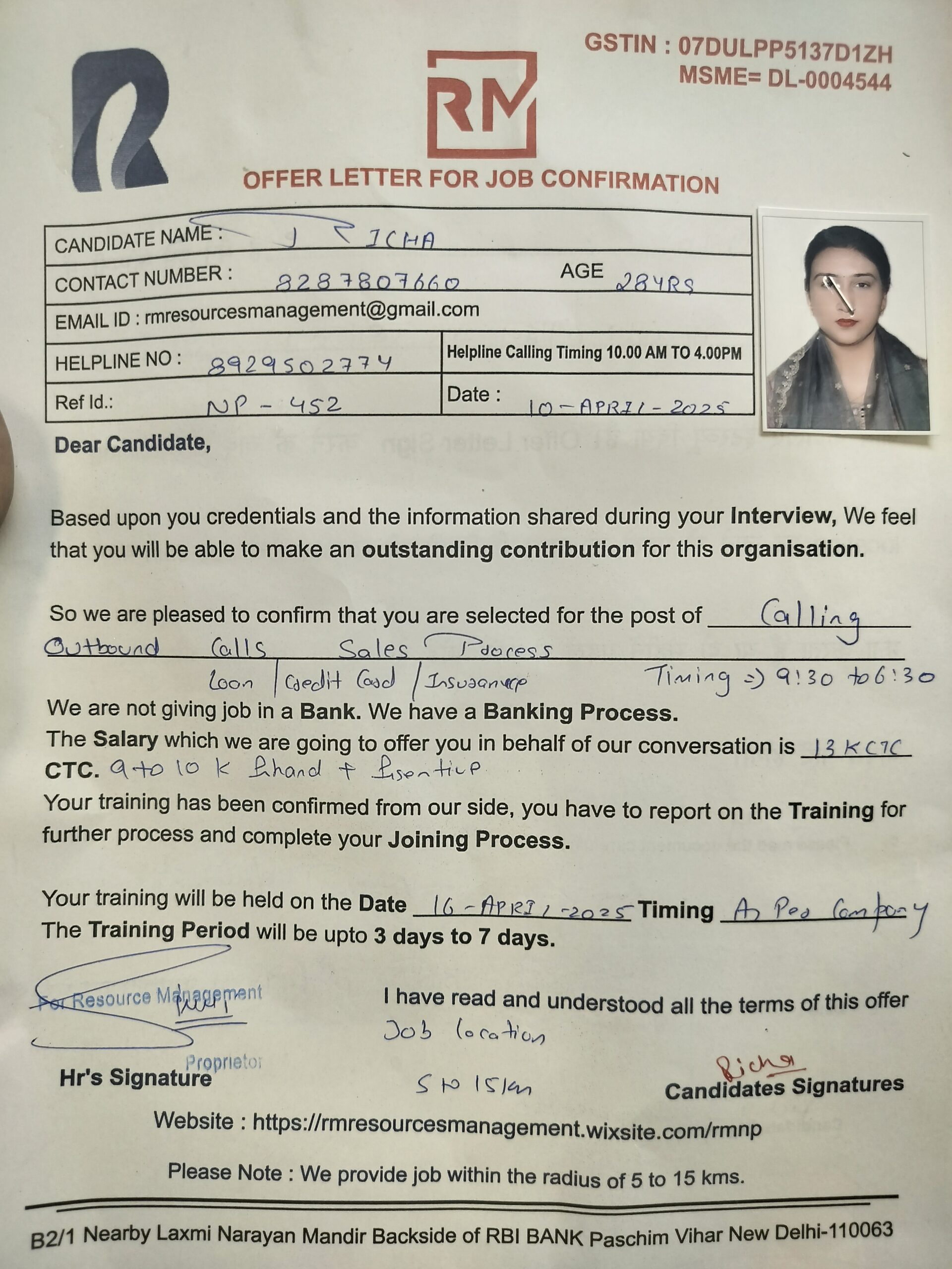 I had applied for a job and I got his message on WhatsApp and he fixed my interview. When I went there he told me about the job of bank process and said that you are being hired for the job of customer support and you will have to get the documents verified and for this they will open a salary account for you in which your salary will be credited. And for this process he took Rs. 2400 from me and said that this will be refunded to you in your account. And he said that you will take the offer latter now. When I paid, he filled the offer letter and made me sing. It was written in it that I am being given a sales job in which I will have to sell credit cards, insurance and loans whose salary will be 9 to 10 K. And I was told that the account details will be given to me along with my 1st salary and the amount taken from me will be given with my 2nd salary after deducting 18% GST and if I leave the job before that then no amount will be refunded to me.