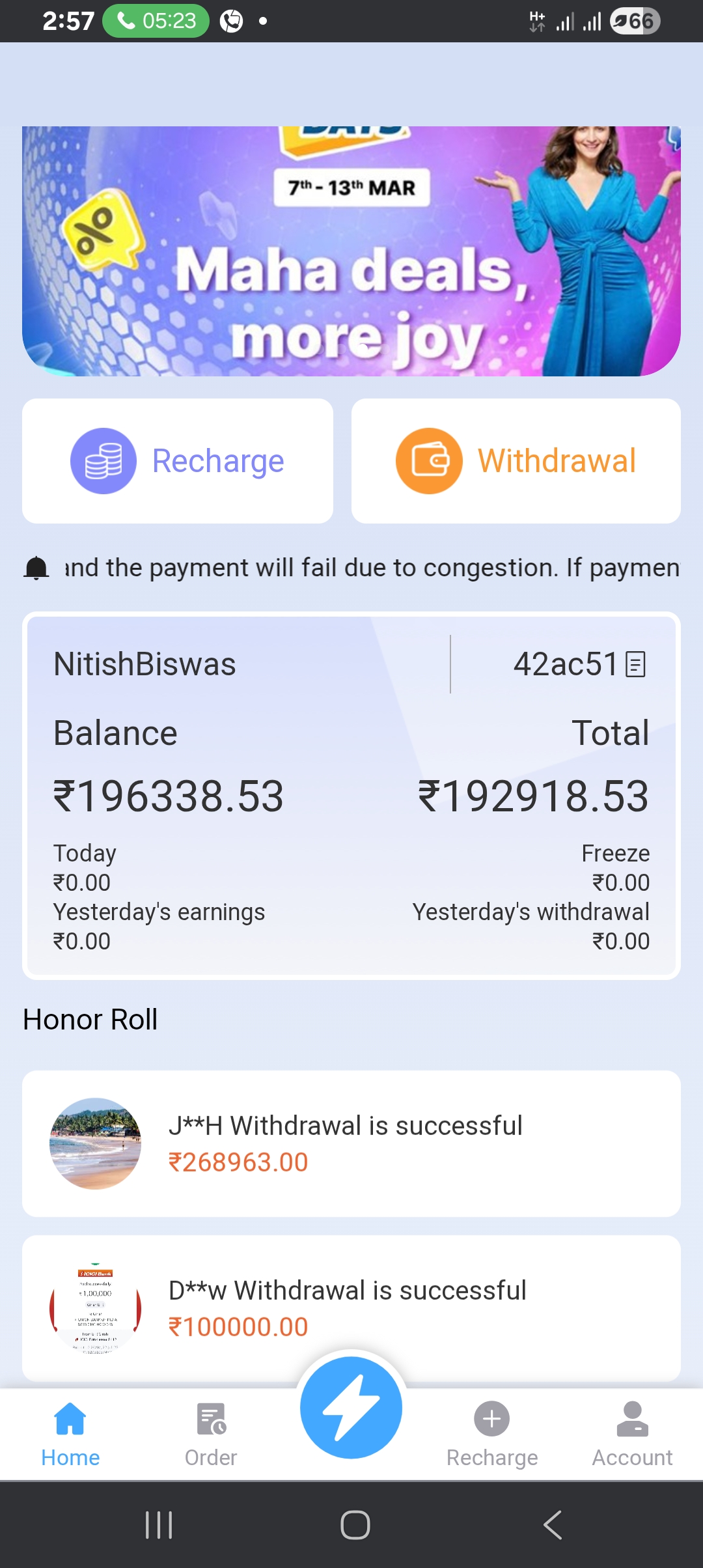 আমাকে পারটাইম কজ দেয়ার নামে আমাকে ama77.in লগইন করে 6 টা অর্ডার করতে বলে প্রথমে আমাকে বলে ছোটো অর্ডার করতে হবে 6 টা অর্ডার কমপ্লিট হলে আমি কমিশন সহ টাকা তুলতে পারবো , সেই মতো আমি ₹200 টাকা থেকে কাজ শুরু করি ₹100000 দিয়ে 6 টা অর্ডার সেষ করি তখন আমার সব টাকা ফ্রিজ করে বলে এর সাথে আর একটা অর্ডার আসে সেটা করতে হবে এখন আমার কাছে আর টাকা নেই তাই আর অর্ডার করতে পারি নি , এক মাস সময় ছিলো , এক মাস পরে সেই অর্ডার অটো কেনছেল হয়ে যায় এর পরে এখন আর এটা অর্ডার দিয়েছে এটা করতে এখনো ₹120000 টাকা এড করতে বলছে এখন আমার কোনো টাকা নেই
