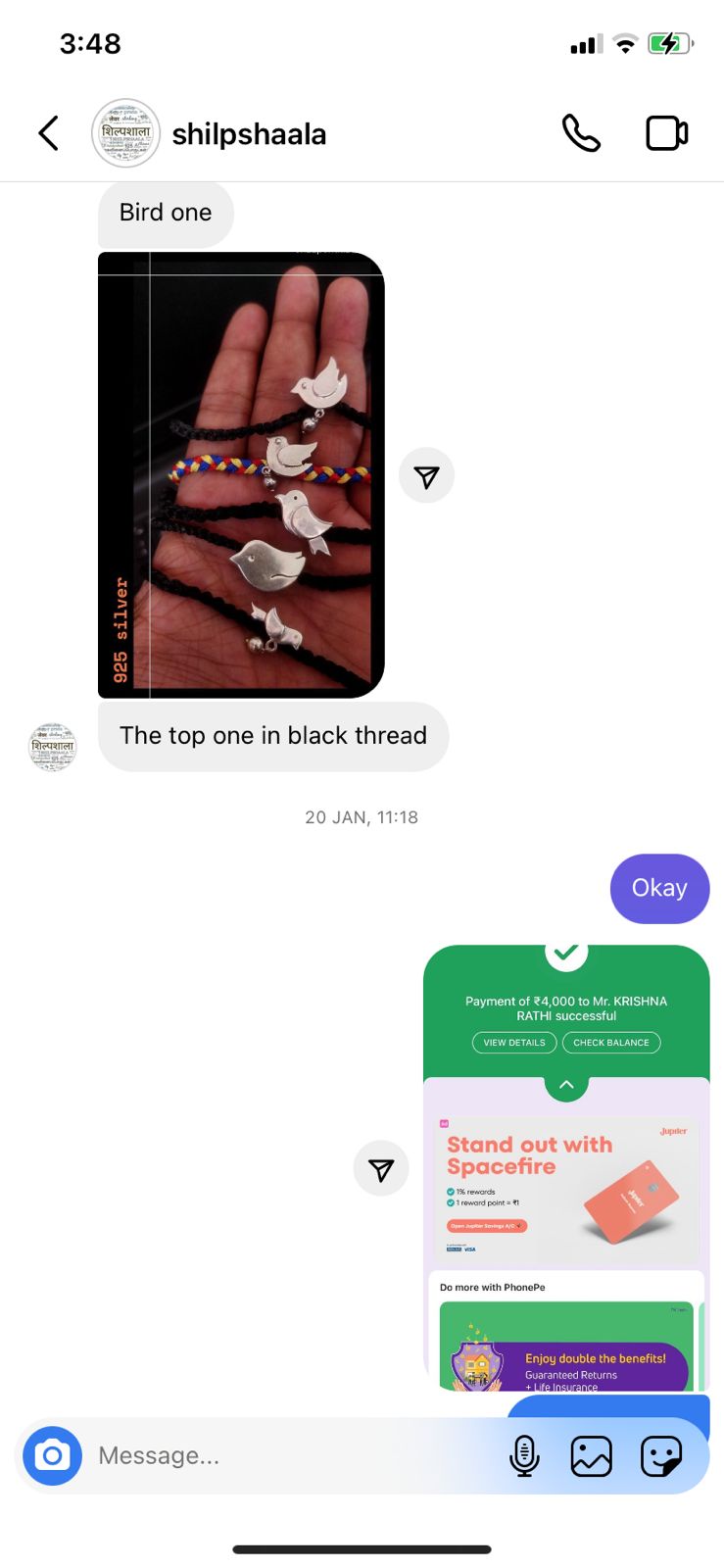 I had ordered some pieces of jewelry from Shilpshaala Instagram page dated 20th January 2022. The owner’s name is Krishna Rathi and he’s based out of Kolkata.