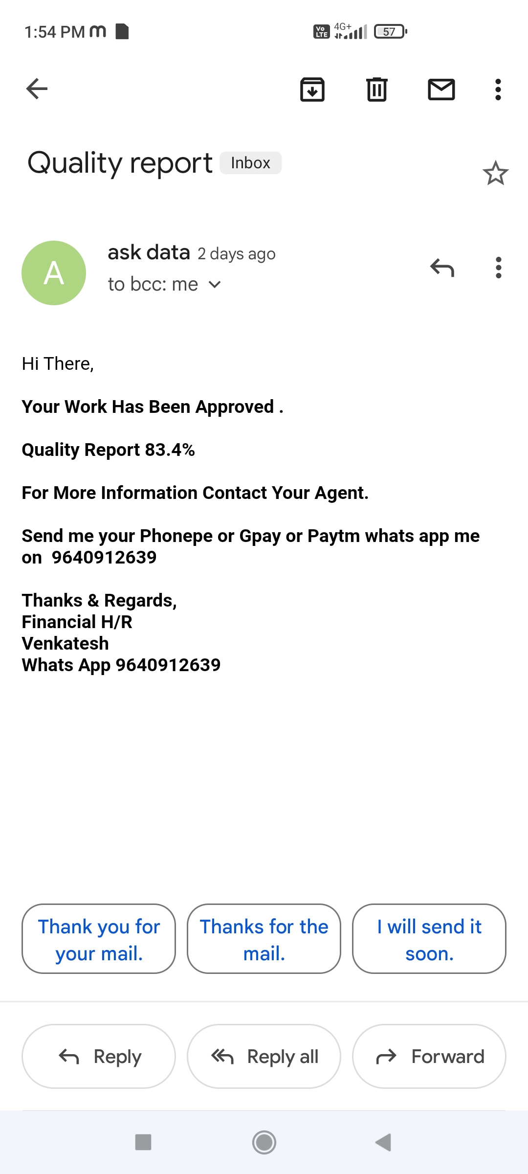 In the name of ask data entry fraud named Nithya 7660868742 called me and assigned data entry work i.e to type 70 pages on 24 th July she send a mail regarding work. Last submission date is 4th July. I completed my and work sent mail. I called her she said quality report will be after 4 th July. I got quality report by mail with quality 83.4%. When I called her and asked for payment , she in return asked payment of 1200/ for service charges , I ignored to pay. She also made to speak with their madam she said if I didn’t pay I don’t get salary, I even Didn’t pay. Please don’t trust these fraudsters. Nithya ( ask data entry ) 7660868742