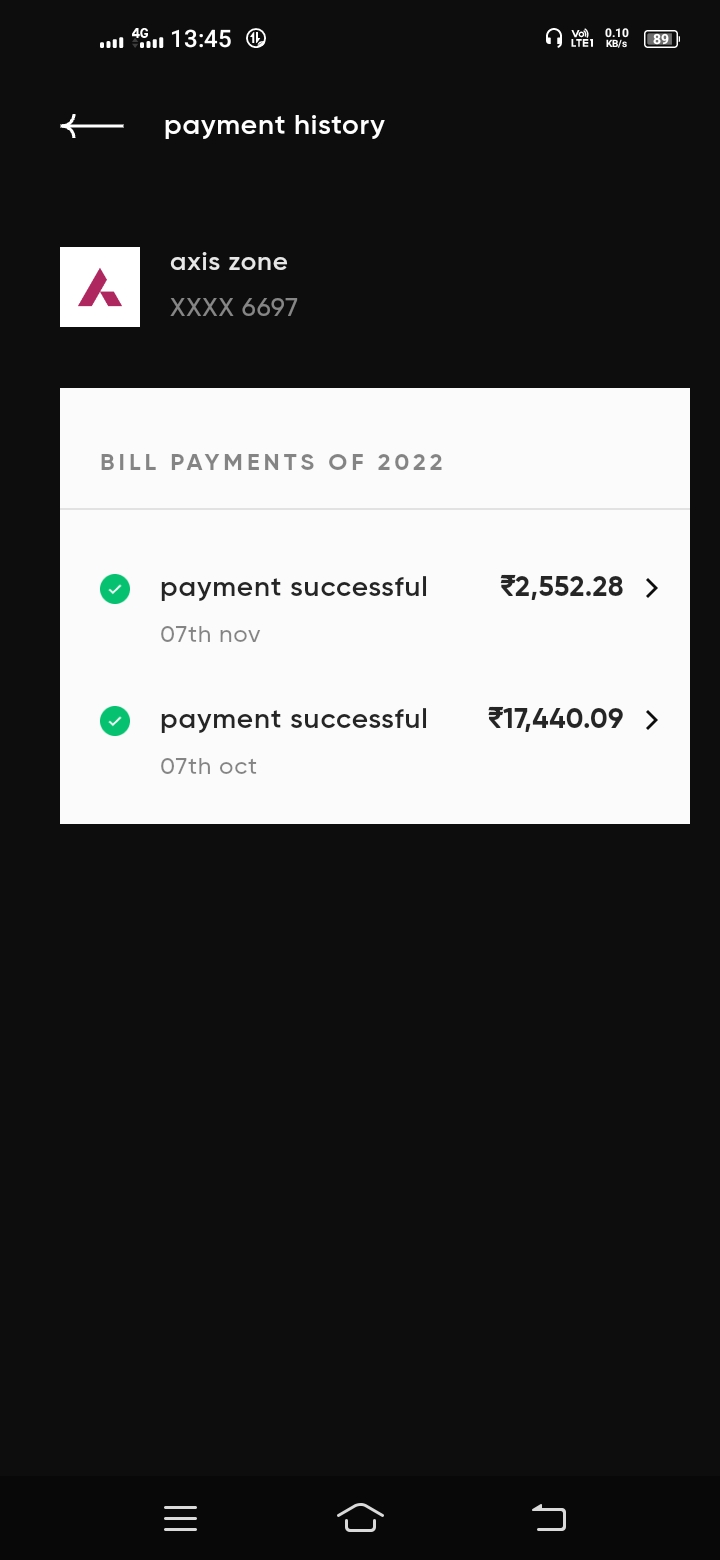 I PAID MY CREDIT CARD BILL OF RS.17440.09 ON 7OCT 2022 BY CRED APP ALTHOUGH MY DUE DATE WAS 10 OCT 2022. CRED APP DEDUCTED AMOUNT FROM MY BANK BUT NOT DEPOSITED IN MY AXIS CREDIT CARD ACCOUNT. THE TRANSACTION IS SHOWING SUCCESSFUL BUT MY BANK IS DENIENG AND THEY CHARGED LATE FEE INTEREST IN MY ACCOUNT.IN MY NEXT CREDIT CARD STATMENT I PAID AGAIN MY USED AMOUNT 0F RS 2552.28 BY CRED APP AND AGAIN THEY HAVE DONE SAME THING THEY HAVE DEBITED AMOUNT FROM THE BANK BUT NOT SUBMITTED IN MY AXIS CREDIT CARD ACCOUNT . MY BANK DOING MENTAL HARRESSMENT OF ME TO CALLING ME ALL DAY FOR PAYMENT AND MY CIBIL SCORE ALSO GOING DOWN WHICH IS VERY BAD FOR MY FINANCIAL FUTURE .