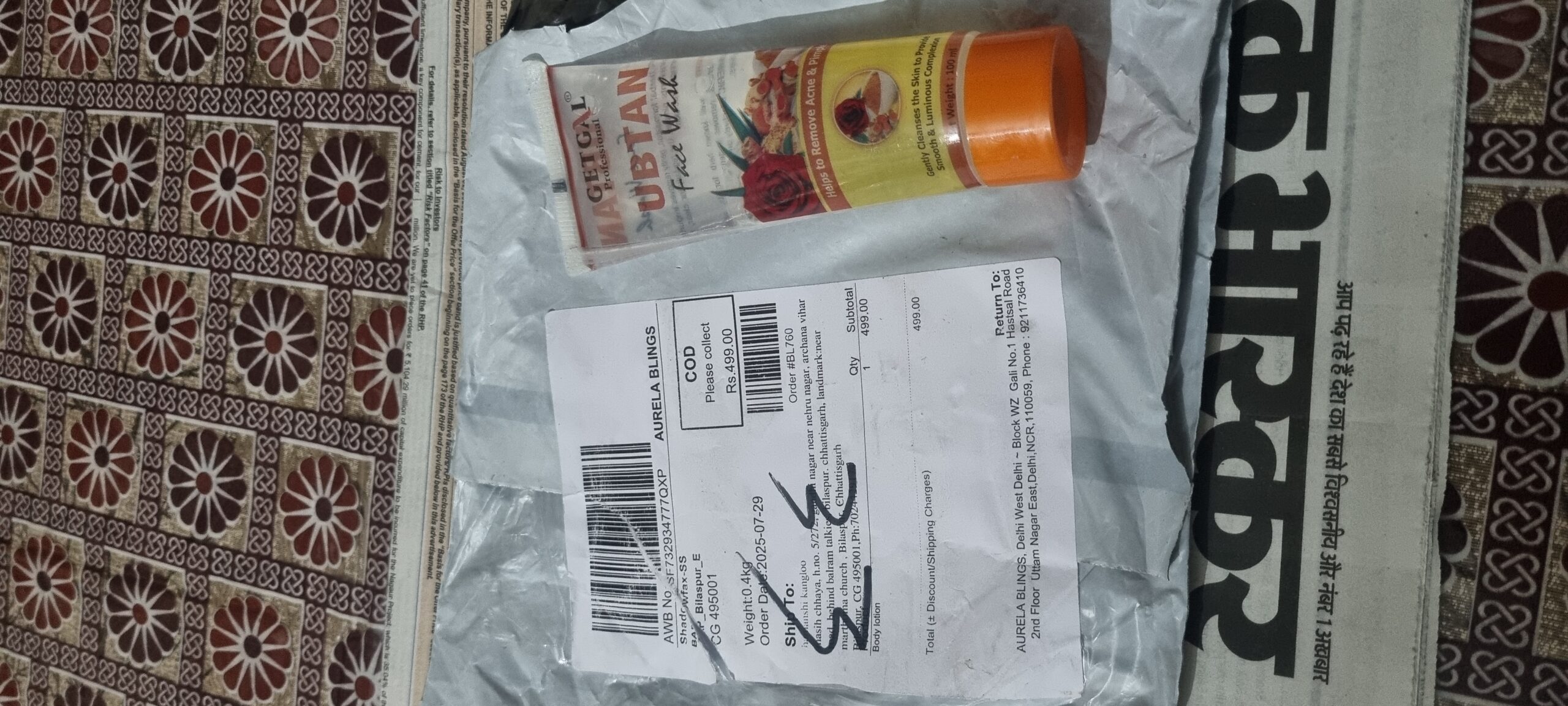Today, I received a call from delivery agent for an order of 499/- , I thought it was one of my orders, the order was received by one of my family member and payment was done by them as they thought I ordered it. However, when I saw it the outer package details says body lotion which I never ordered and when I opened it it was used face wash I received again which I never ordered.