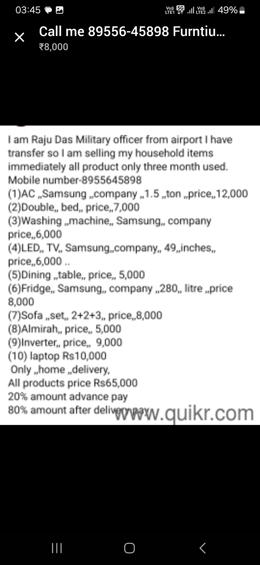 While searching for household furniture and appliances online for my new flat in Ahmedabad, I came across an advertisement on Quikr offering second-hand household items. I contacted the seller, Mr. Raju Das, who claimed to be a CRPF officer recently transferred and urgently needing to sell his items before relocation.