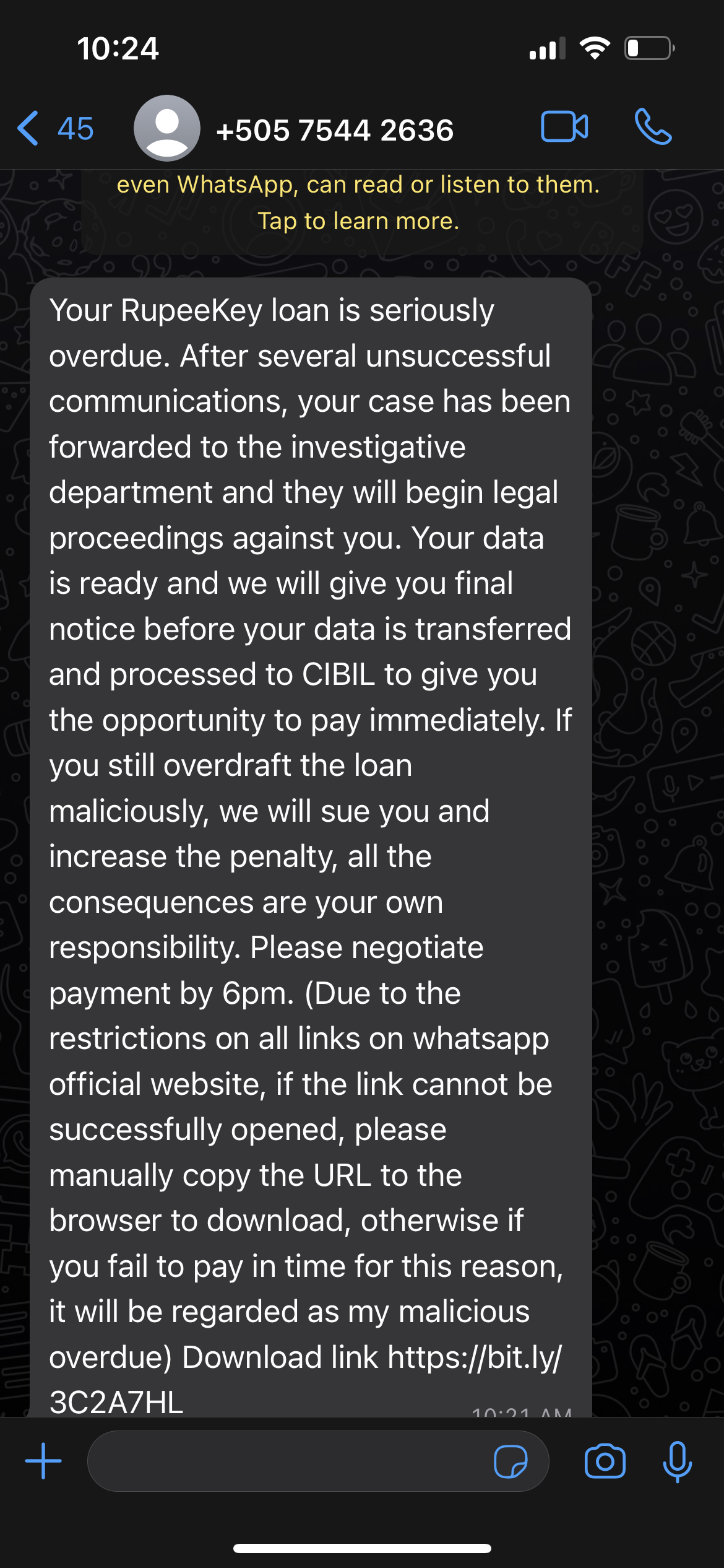For last 2 days, I am getting back to back SMS’s and WhatsApp messages stating that I have to pay loan overdue by today, else they will send messages to my friends and family as well as they will drag me to court. These messages are on behalf of Hugo Cash, Smile Cash and RupeeKey. In those messages there is no other details except a link to down these apps respectively as these apps won’t be available on Google Play Store. If an app is not available in Play Store then how I can download it and availed loan from them. They are literally trying to make people scared and download the app. So that they can get our sensitive information and can loot money from us. Getting these kind of SMS really making me worried. Please look into this and resolve it.