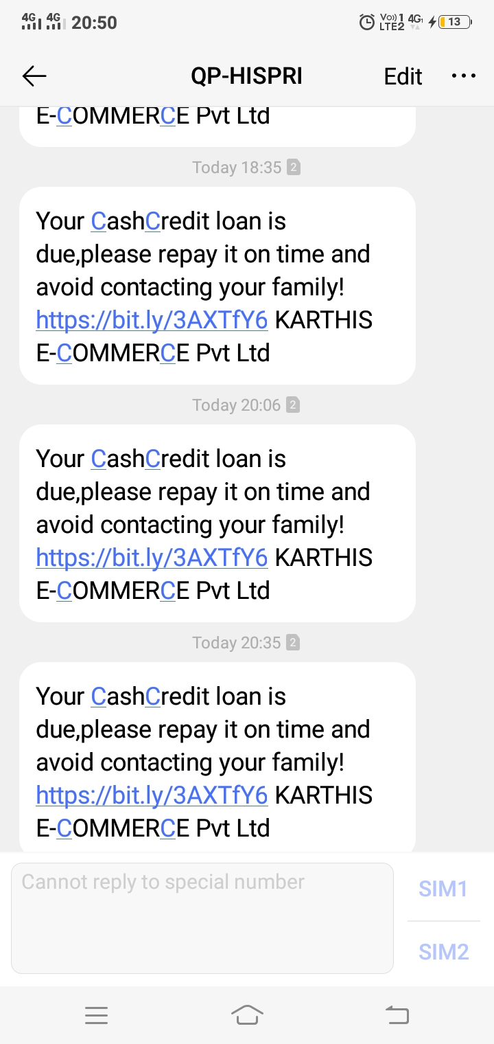 Since yesterday 27.09.22 I am receiving WATS app and text messages from Karthis e-commerce pvt Ltd. Saying that I have borrowed loan and today is the due date and in that one app link is their if you click on that link cash credit named application gets downloaded.