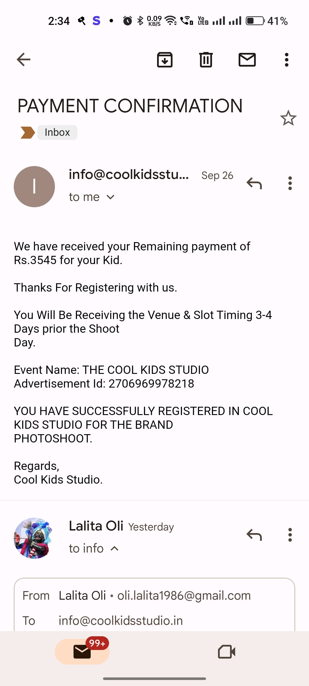 Coolkidsstudio ko Maine baby ke liye register Kiya tha after pic send ki unhone bola ki measurements send karna hai baby ka or aap ko register karna padega 3545 as registration fees 15 September 2023, after 26 September again saying to pay 3545 for dress and ticket. After Payment not picking my call and msg. My baby shoot 1 oct ko tha par 8 oct ko resdule kiya gaya par my call and msg ka reply bhi nahi de rahe hai mujhe to lagta hai coolkidsstudio fake company hai Jo baby ke naam par parents ko loot Rahi hai
