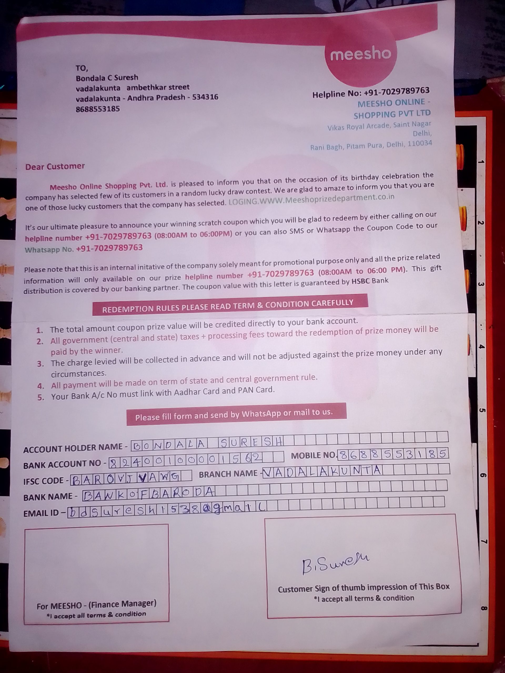 Meesho prize money scratch card 9.50000 my full details bank account details