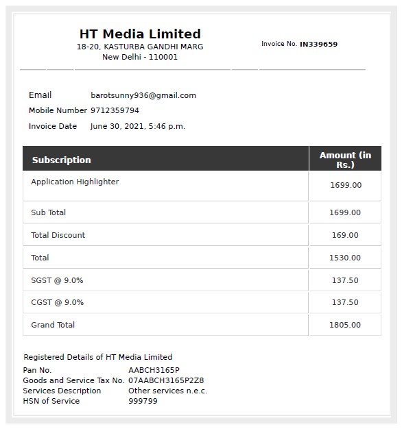 On 30th June’21 I had received few calls from persons of Shine.com regarding job opportunities in MNCs offering suitable work from home profiles. After ignoring their lucrative calls, in evening received another call from lady claiming to be from Shine.com and it’s subsidary of HT Media Ltd. They asked me to purchase so called ‘Application Highliter’ products for 3 months and due to month ending they offered it with few discounts finaly costing INR 1805 (Earlier they shown it for INR 2005).